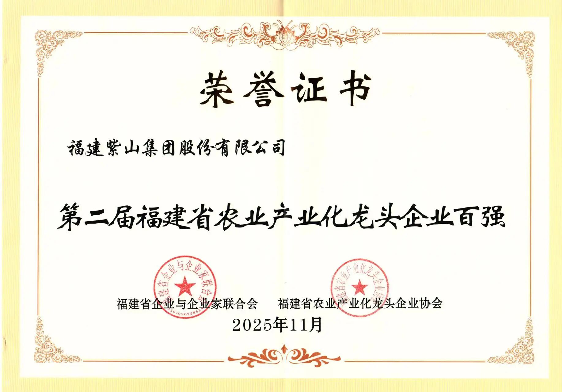 11月27日,福建省企业与企业家联合会、福建省农业产业化龙头企业协会在福州联合发布第二届福建省农业产业化龙头企业100强榜单,紫山集团凭借卓越的综合实力与深厚的产业根基再次荣耀登榜,荣获第二届福建省农业产业化龙头企业100强。